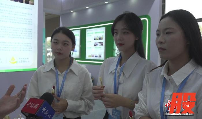 10月17日,中国药都江西樟树第56届全国药材药品交易会上,来自医药院校的学子向记者介绍“中药+”口红展品。姜涛摄