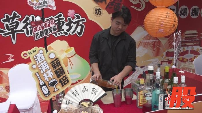 10月17日,中国药都江西樟树第56届全国药材药品交易会上,来自当地酒吧的“95后”主理人正在调制草本鸡尾酒。姜涛摄