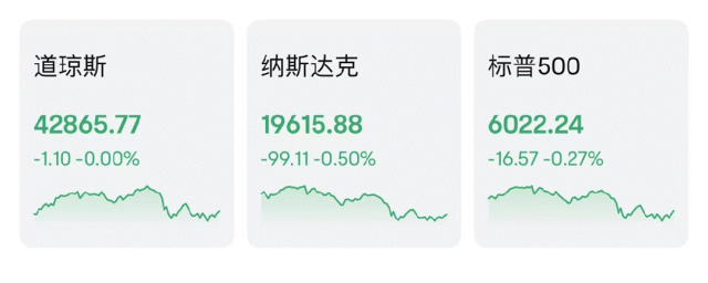 美东时间6月11日,美股三大指数集体收跌。截至收盘,道指微跌1.1点,报42865.77点;纳指跌0.5%,报19615.88点;标普500指数跌0.27%,报6022.24点。